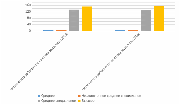 Что касается стажа сотрудников ООО МФК «Саммит» (учитывается общий стаж по записям в трудовой книжке, а не только стаж работы на исследуемом предприятии), то необходимо отметить, что значительная доля работающих обладает длительным стажем работы – в совокупности, сотрудников, имеющих трудовой стаж более 10 лет в ООО МФК «Саммит» – 48,1%, хотя в 2015–м году этот показатель был велик на 49,5%. Соответственно, возросло количество малоопытных сотрудников (со стажем до 5 лет) с 74 человек в 2015 г. до 79 человек в 2016 г.