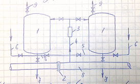 1 – напорные баки, 2 – диафрагма, 3 – ротаметр, 4 – трубопровод подачи воды в баки, 5 – трубопровод подачи отдозируемого р-ра реагента в трубопровод исходной воды, 6 – трубопровод подачи р-ра реагента в баки, 7 – отвод стоков в канализацию, 8 – трубопровод исходной воды, 9 – трубопровод выпуска воздуха.
