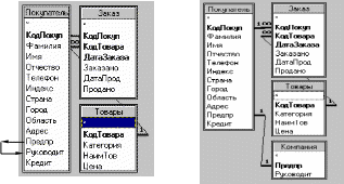Результатом нормализации является получение базы данных в виде набора отдельных таблиц. В схеме данных особенно важно определить, как будут взаимодействовать различные таблицы. В реляционной базе данных связь между таблицами устанавливается с помощью связующих полей (см. Рис.1.5).