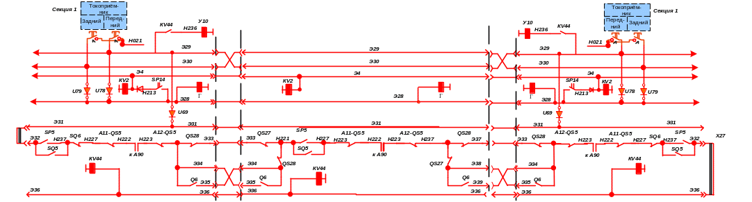 Автомат SF21 «Токоприемники» не восстанавливать, кнопки «Токоприемник передний», «Токоприемник задний» не включать, на блокировках реле KV44 объединить провода Э29 - Н203. Подъем опускание токоприемника кнопкой «Главный выключатель».