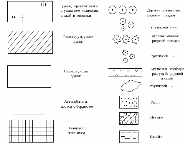 Условные графические обозначения, установленные для выполнения чертежей генеральных планов, приведены на рис. 37.