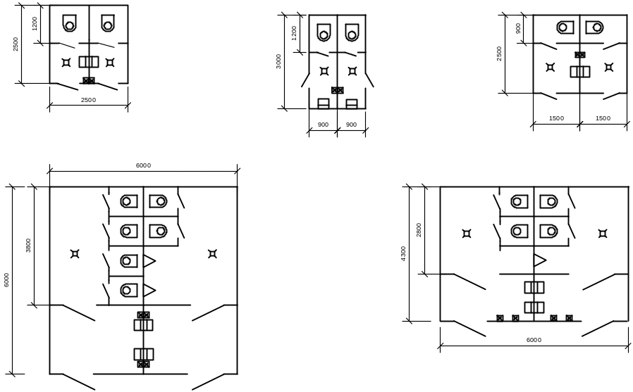 Стенки душевых и уборных кабин можно обводить одной сплошной линией. На планах уборных и душевых кабин по ГОСТ должны быть изображены санитарно-технические устройства: умывальники, раковины, унитазы, трапы (рис. 40).