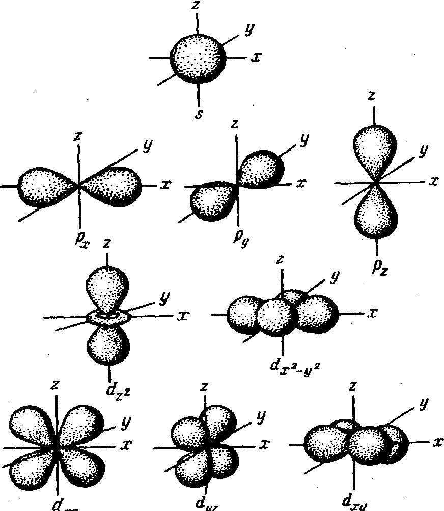 В третьем квантовом уровне n = 3 орбитальное квантовое число l может принимать три значения: l = 0(3s) l = 1(3p) l = 2(3d). Форма орбитали более сложная. Увеличение l приводит к дальнейшему усложнению формы орбитали.