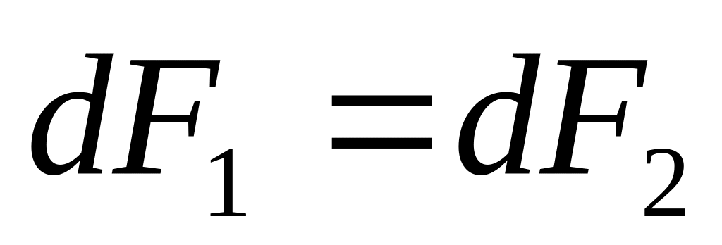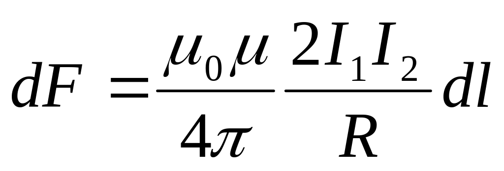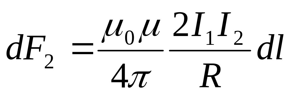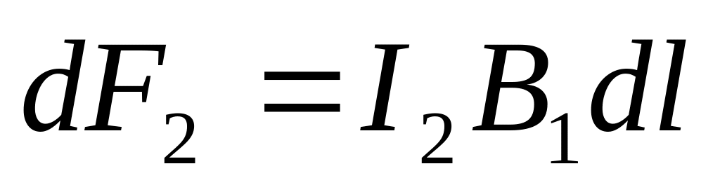 Рассуждая аналогично, можно показать, что сила dF1 с которой магнитное поле тока I2 действует на элемент dl первого проводника с током I1, направлена в противоположную сторону и по модулю равна