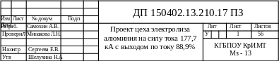 В дипломном проекте приведены расчёты материального, электрического и теплового балансов, расчёты конструктивных элементов электролизёра. Экономические расчеты подтверждают рентабельность и целесообразность проекта цеха электролиза.Так же в дипломный проект входит графическая часть на 4 листах формата А1, выполненная в соответствии с требованиями ЕСКД.
