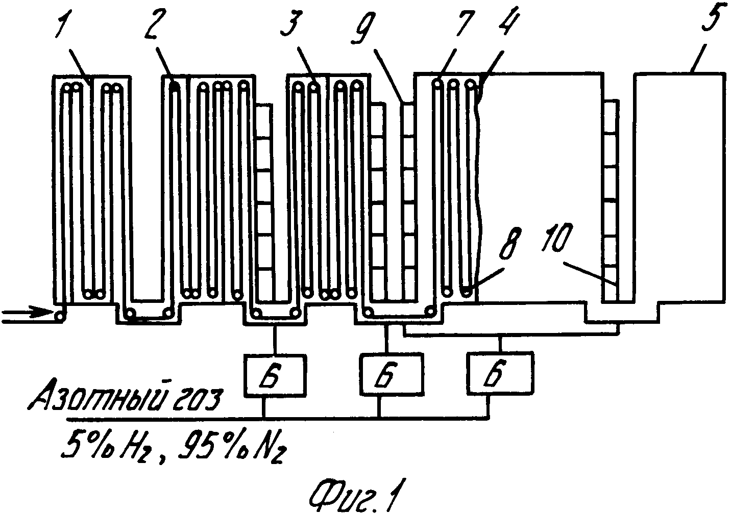 1 – камера нагрева, 2-4 – выдержки, 5 – камера охлаждения, 6 - скрубберы, 7 – ролик, 8 – коллектор, 9-10 – защитная атмосвера.