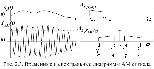 Амплитудная модуляция – процесс изменения амплитуды несущего колебания, соответствующего изменению непрерывного информационного сигнала [21, 32, 39].