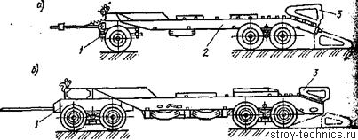 Рис. 2. Прицепы-тяжеловозы трехосный (а), четырехосный {б) 1 — поворотная тележка; 2 — рама; 3 — откидной трап