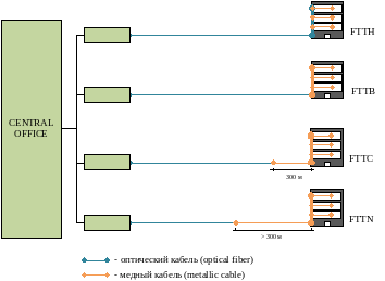 FTTx (Fiber to the x) – это термин, связанный с архитектурой широкополосной сети, в которой от узла связи до определенного места (точка «x») доходит волоконно-оптический кабель, а далее, до абонента, - медный кабель (возможен и вариант, в котором оптика прокладывается непосредственно до абонентского устройства).