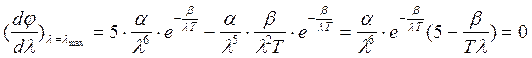 Выражение (1.17) известно под названием закон смещения Вина – длина волны λmax, соответствующая максимальному значению функции Кирхгофа φ(λ,Т) черного тела, обратно пропорциональна его термодинамической температуре. Другими словами положение максимума кривой зависимости от длины волны интенсивности излучения черного тела (рис. 1.3) зависит от его температуры – чем выше температура, тем сильнее максимум смещается в коротковолновую сторону.