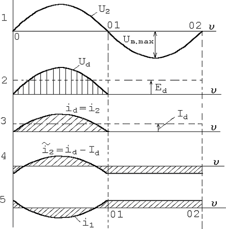 Кривые выпрямленного тока и напряжения представляют собой полусинусоиды (рис.2), поэтому схема называется однополупериодной.