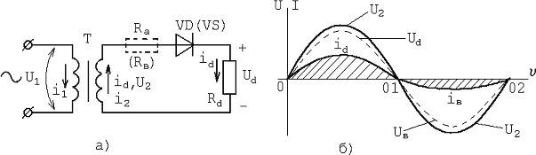 Рис.1. Однополупериодная схема выпрямления (а) и кривые токов и напряжений (б)