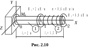 Пример 2.4. Для ломаного пространственного стержня, изображенного на рис. 2.13, а, построить эпюры внутренних усилий.