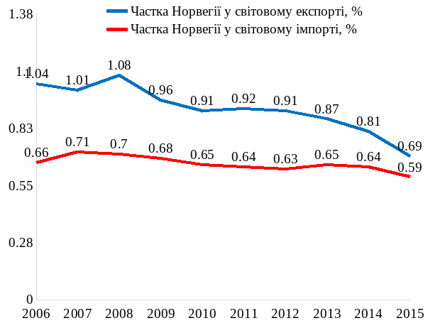 - •Частка Норвегії у світовому експорті та імпорті в 2006 – 2015 роках