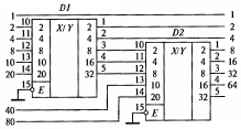 Микросхемы представляют собой постоянные запоминающие устройства, программирование которых произведено на заводе-изготовителе. Одна микросхема К155ПР6 позволяет преобразовать двоично-десятичный код чисел от 0 до 39 (входы 2,4,8,10,20) в двоичный выходы (2,4,8,16,32), а другая микросхема К155ПР7 – двоичный код чисел от 0 до 63 (входы 2,4,8,16,32) в двоично-десятичный (выходы 2,4,8,10,20,40).