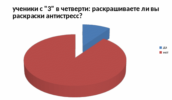 Анкеты мы разделили на две части. В одной части были анкеты опрашиваемых, которые учатся на 4 и 5, в другой части учеников, у которых есть за четверть тройки. Проанализировав ответы, мы пришли к выводу, что из 100 % опрошенных хорошистов и отличников 65 % учеников систематически раскрашивают раскраски антистресс. (Приложение 3) Среди учеников имеющих тройки в четверти раскрашивают раскраски антистресс 10 % из 100 % опрошенных. Подведя итоги анкетирования мы выяснили, что раскрашивание раскрасок антистресс действительно влияет на успеваемость ученика, так как направив внимание на рисунок, ученик может отвлечься от всех тревог. За счет повторяющихся движений мозг получает хороший отдых, раскраски антистресс прогоняют негативные эмоции, дают возможность проявить художественные способности. Действуют раскраски просто: они целиком захватывают наше внимание и тем самым дают возможность переключиться на хорошее.