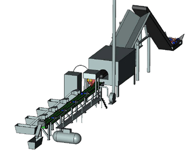 Входящим материалом является сыпучий лом пластмассы (если он прессованный, то требуется предварительная установка разрывателя тюков). Далее с помощью специальной системы подачи и системы конвейеров поток распределяется на главном транспортере, на котором установлен блок определения материала.