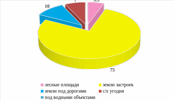 Из данных диаграммы 2 следует, что наибольший удельный вес в структуре занимают земли застроек ‑ 75%. Лесные площади занимают 7% в структуре земельных угодий. Значительное место занимают земли под дорогами - 10%.