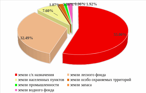 Общая площадь земельного фонда Чувашской Республики за 2016 год составила 1834,5 тыс. га. Наибольшую площадь занимают земли сельскохозяйственного назначения, которые составляют 55%.