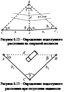 В том случае, когда на линии АВ нет видимости (рисунок 6.13), то для определения недоступного расстояния АВ измеряют длины сторон b1 и b2 и угол γ на точке С.