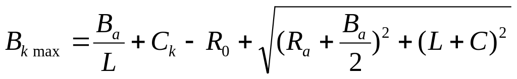 где R0 – радиус кривизны круговой траектории, по которой движется середина заднего моста тягача; Ва, L,C – ширина, база и передний свес соответственно; Ск – сдвиг заднего моста прицепа относительно моста тягача.