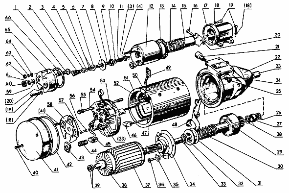 1 Болт контактный; 2 Пружина; 3 Шайба специальная; 4 Скоба; 5 Шайба; 6 Шайба изоляционная; 7 Диск контактный; 8 Плунжер; 9 Втулка; 10 Шайба; 11 Пружина; 12 Ярмо; 13 Прокладка; 14Пружина; 15 Якорь; 16 Штифт; 17 Фланец; 18 Шайба; 19 Винт; 20 Шайба; 21 Ось рычага; 22 Крышка; 23 Вкладыш; 24 Шайба; 25 Гайка; 26 Шайба; 27 Обойма; 28 Полукольцо упорное; 29 Привод; 30 Пружина; 31 Втулка отводки (задняя); 32 Втулка отводки (передняя);33 Кольцо; 34 Подшипник; 35 Шайба; 36 Болт специальный; 37 Якорь; 38 Коллектор; 39 Шайба; 40 Винт; 41 Кожух; 42 Кольцо уплотнительное; 43 Изолятор пружины; 44 Пружина; 45 Щетка неизолированная; 46 Щетка изолированная; 47 Катушки; 48 Рычаг отводки;49 Наконечник; 50 Втулка изоляционная; 51 Корпус; 52 Катушки; 53 Крышка; 54 Болт стяжной; 55 Шайба; 56 Шайба; 57 Винт; 58 Траверса; 59 Шайба; 60 Гайка; 61 Шайба; 62 Гайка; 63 Шайба; 64 Шайба; 65 Крышка; 66 Прокладка