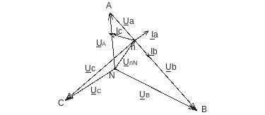 В случае включения несимметричного приёмника без нейтрального провода между нейтральной точкой генератора и нейтральной точкой приёмника возникает напряжение смещения нейтрали.