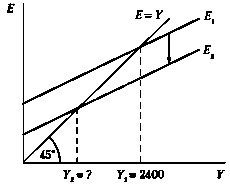 Задание 6. В закрытой экономике от величины текущего выпуска зависят только потребительские расходы. Предельная склонность к потреблению составляет 0,6. Вследствие увеличения автономных налогов на 60 млрд руб. положение кривой совокупных планируемых расходов изменяется так, как показано на графике (рис. ____). Определите новое значение равновесного выпуска.