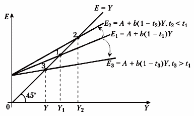 где A=Ca+I+G+bTr−bTa; b — предельная склонность к потреблению, 0 < b < 1; t — предельная налоговая ставка, 0 < t < 1.