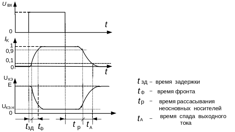 Процесс переключения биполярного ключа. При использовании транзистора в качестве ключа представляет интерес изучение процесса переключения, определяющего его быстродействие. Переходные процессы при отпирании и запирании ключа можно разделить на 5 этапов. Они показаны на рис. 3.9: время задержки переключения tЗ, формирования фронта tф, время накопления избыточных носителей в базе, время рассасывания избыточного заряда tр и время спада выходного тока tА.