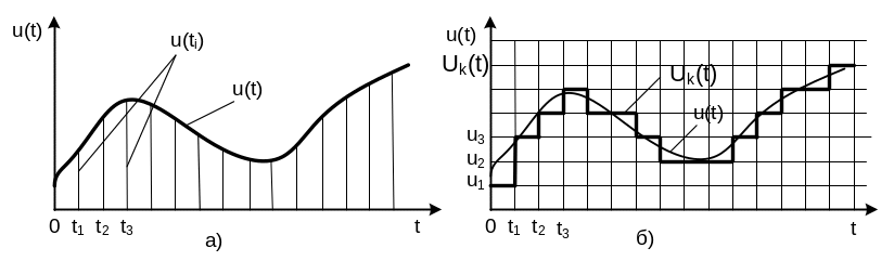 При преобразовании напряжения в цифровой код используются три независимые операции: дискретизация, квантование и кодирование.