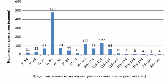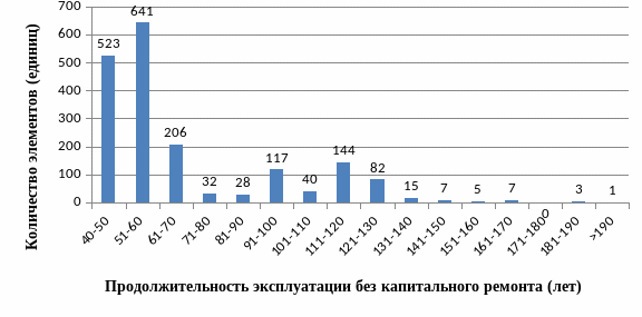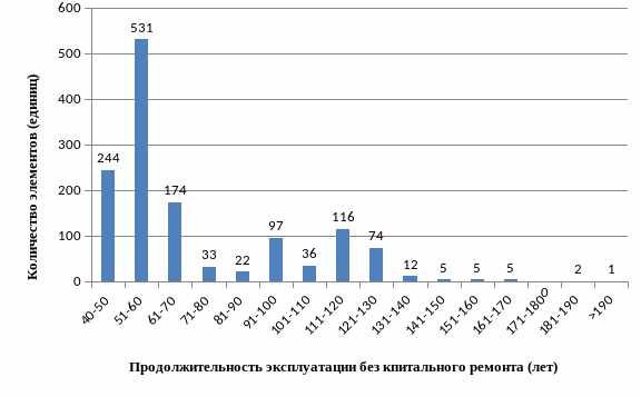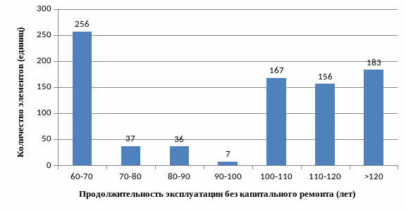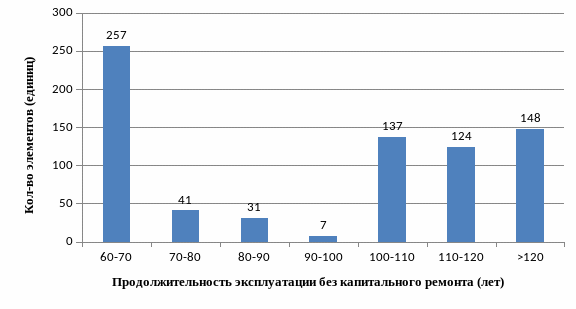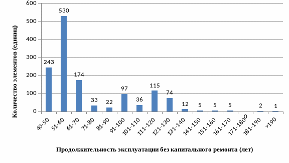 Наибольшее количество многоквартирных домов без капитального ремонта фундаментов сверх нормативного срока приходится на временной отрезок от 60 до 70 лет. Остальные данные представлены на рисунке 2.6.