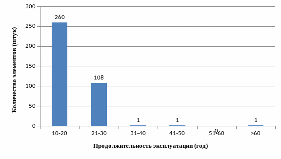 Наибольшее количество многоквартирных домов без капитального ремонта подвалов сверх нормативного срока приходится на временной отрезок от 60 до 70 лет. Остальные данные представлены на рисунке 2.6.