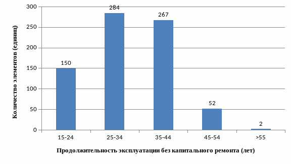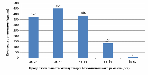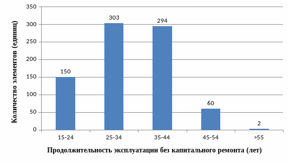 Наибольшее количество многоквартирных домов без капитального ремонта деревянных перекрытий сверх нормативного срока приходится на временной отрезок от 35 до 44 лет. Остальные данные представлены на рисунке 2.8.