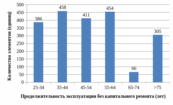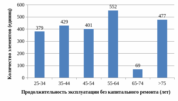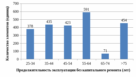 Наибольшее количество многоквартирных домов без капитального ремонта деревянных перекрытий сверх нормативного срока приходится на временной отрезок от 55 до 64 лет. Остальные данные представлены на рисунке 2.7.