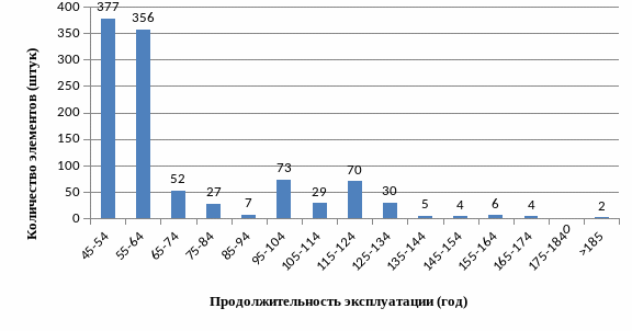 Наибольшее количество многоквартирных домов без капитального ремонта системы теплоснабжения сверх нормативного срока приходится на временной отрезок от 35 до 44 лет. Остальные данные представлены на рисунке 2.16.