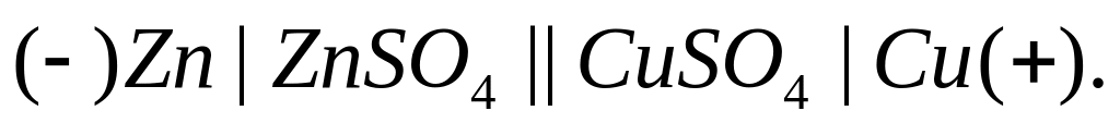 ион окисляется. При этом энергия реакции превращается в электрическую энергию. Схематически любую электрохимическую систему принято записывать следующим образом: слева указывается тот электрод, на котором идет процесс окисления, затем примыкающий к нему электролит, далее раствор, контактирующий со вторым электродом и, наконец, второй электрод на котором идет процесс восстановления