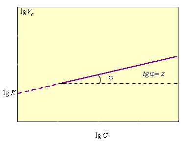 Прологарифмировав уравнение (5.2), получим lg V = lg K + z lg C; из графической зависимости (рис. 5.2) получаем lg K и z = tg φ.