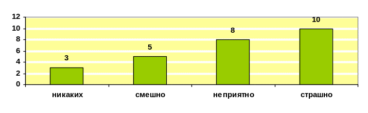 Реакция на просмотр социальной рекламы разделилась следующим образом: 3 человека (11,5 % от группы) не испытали никаких эмоций в связи с просмотром, 5 опрошенных, что составляет 19,2%, ролики показались смешными, 8 человек (30,8 %) испытали в основном неприятные чувства, большинство же опрошенных – 10 человек, или 38,5 % признались, в том, что изображения вызывают страх.