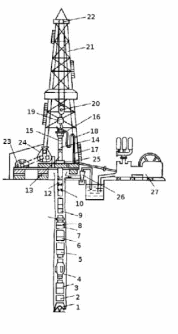 Рисунок 2 – Буровая установка: 1 – Долото; 2 – Наддолотная утяжеленная бурильная труба; 3 – Переводник; 4 – Центратор; 5 – Муфтовый переводник; 6,7 – Утяжеленные бурильные трубы; 8,15 – Переводник; 9 – Предохранительное кольцо; 10 – Бурильные трубы; 11 – Предохранительный переходник; 12,14 – Переводники штанговые (нижний и верхний); 13 – Ведущая труба; 16 – Вертлюг; 17 – Стояк; 18 – Шланг; 19 – Крюк; 20 – Талевый блок; 21 – Вышка; 22 – Кронблок; 23 – Редуктор; 24 – Лебедка; 25 – Ротор; 26 – Шламоотделитель; 27 – Буровой насос