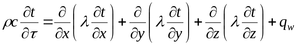 Изменение удельной внутренней энергии можно представить в виде du=cdt, где с – удельная теплоёмкость, Дж/(кгК). Подставим (в), (г) в (2.2) и, сокращая на величину элементарного объёма, получим