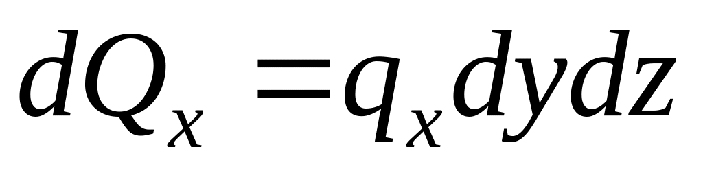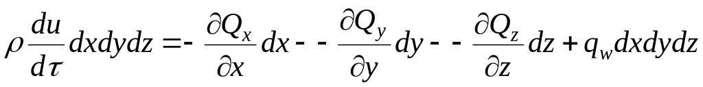 Рассмотрим элементарный объём с размерами dx, dy, dz (рис.4). Изменение внутренней энергии данного объёма вызвано разностью потоков тепла, входящих в объём и выходящих из него через грани, а также теплом, выделяющимся внутри объёма, например, при прохождении электрического тока или вследствие химических реакций. Изменение внутренней энергии элементарного объёма запишем в виде