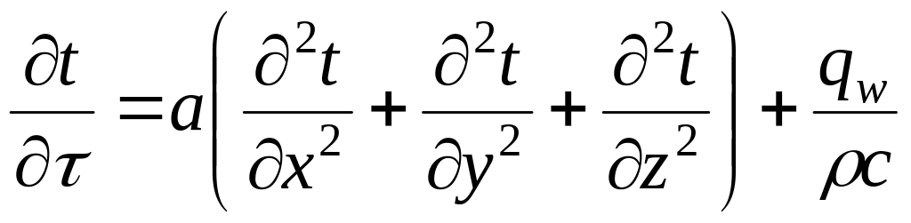 Данное уравнение называется дифференциальным уравнением теплопроводности для твёрдого тела. Уравнение (2.3) относится к дифференциальным уравнениям параболического типа. Решение этого уравнения связано с большими трудностями, поэтому во многих практически важных случаях это уравнение стремятся упростить. Если коэффициент теплопроводности в заданном диапазоне температур изменяется незначительно, то его можно принять постоянным и равным среднему значению. В этом случае можно вынести из под производных. Уравнение (2.3) примет вид.
