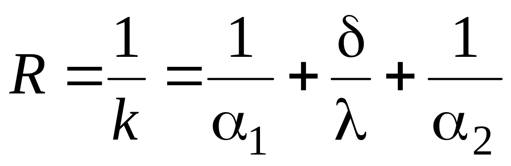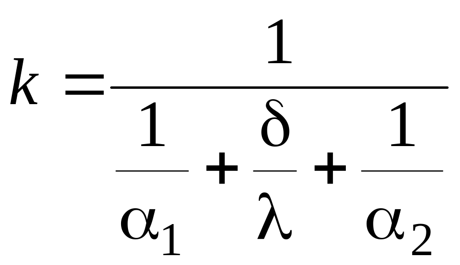 Величина k называется коэффициентом теплопередачи и имеет ту же размерность, как и коэффициент теплоотдачи, Вт/м2К. Величина обратная k называется полным термическим сопротивлением теплопередачи