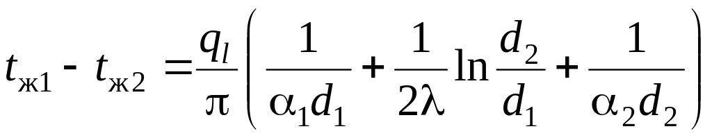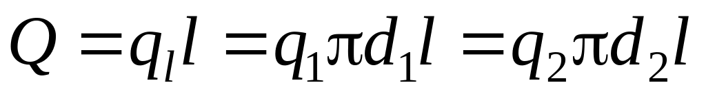 Будем считать, что цилиндр бесконечно длинный, поэтому можно пренебречь потерями тепла с торцов. Температуры жидкостей внутри и снаружи трубы, а также коэффициенты теплоотдачи постоянны. В таком случае тепло будет передаваться только по радиусу. В стационарном случае количество тепла, переданное от одной жидкости к стенке равно количеству тепла переносимо- |