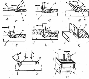 Рис. 1.2 - Схемы основных способов наплавки плавлением: а — угольным (графитовым) электродом расплавлением слоя сыпучего зернистого наплавочного сплава, б — ручной дуговой покрытым электродом или легирующим покрытием, в — неплавящимся вольфрамовым электродом в защитных инертных газах с подачей в дугу присадочного прутка, г — плавящимся электродом проволокой в защитных газах, д — механизированная (автоматическая, полуавтоматическая) дуговая плавящейся проволокой под флюсом, е — плавящейся лентой в защитных газах или под флюсом, ж — расплавлением плазменной струей плазмотрона, предварительно наложенного или спеченного из порошков наплавочного материала (2), з — электрошлаковая наплавка плавящимися электродами с перемещаемым составным медным ползуном, во всех случаях 3 — наплавляемая деталь, 4 — наплавленный слой