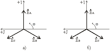 Систему ЭДС, в которой ЭДС фазы B отстает по фазе от ЭДС фазы A, а ЭДС фазы C по фазе – от ЭДС фазы B, называют системой прямой последовательности. Если изменить направление вращения ротора генератора, то последовательность фаз изменится (рис. 3.4б) и будет называться обратной.