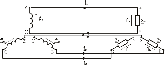 Трехфазная цепь состоит из трех основных элементов: трехфазного генератора, в котором механическая энергия преобразуется в электрическую с трехфазной системой ЭДС; линии передачи со всем необходимым оборудованием; приемников (потребителей), которые могут быть как трехфазными (например, трехфазные асинхронные двигатели), так и однофазными (например, лампы накаливания).