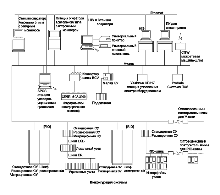 Система управления CENTUMCS 3000 относится к классу распределенных интегрированных систем управления. Ее конфигурация обеспечивает комплексное управление предприятием, объединяя в одно целое: контрольно-измерительную аппаратуру, диспетчерские пункты, компьютерные системы и системы управления других производителей, функционирующие на предприятии.