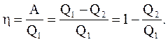 Принцип работы теплового двигателя от термостата с более высокой температурой T1, называемого нагревателем, за цикл отнимается количество теплоты Q1, а термостату с более низкой температурой T2, называемому холодильником, за цикл передается количество теплоты Q2, при этом совершается работа A = Q1-Q2. Термический КПД двигателя